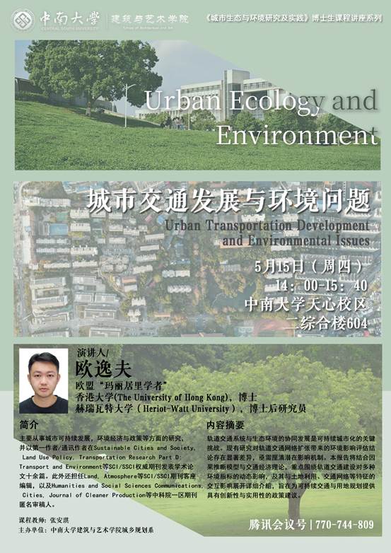 《城市生态与环境研究及实践》博士生课程首场学术讲座在天心校区二综合楼604成功举办。本课程旨在通过国际学术交流与创新研讨,帮助博士生把握城市生态环境领域前沿动态,扩宽学生学术视野和创新能力。本次活动由课程负责人、城乡规划系张安琪讲师策划组织,特邀英国赫瑞瓦特大学"玛丽·居里"学者欧逸夫博士后作主题演讲。讲座以"城市交通发展与环境问题"为核心,城乡规划系博士新生及部分研究生参与研讨。