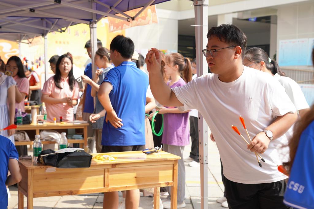 趣味横生,共游中秋之乐。趣味游戏区设置了投壶、钓花灯与套月饼三个富有传统特色的小游戏。箭矢如飞,稳稳地射入壶口,发出清脆的声响;钓竿在手,灵巧地摇动,轻轻扯动那摇曳的花灯;圆圈抛出,精准地套中诱人的月饼,伴随着同学们的欢呼与喝彩。