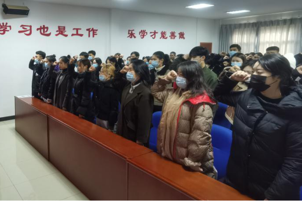 宣誓仪式在雄壮的国歌声中拉开帷幕。陈乐凯老师首先向参加宣誓仪式的党员讲述了入党宣誓仪式的特殊意义,勉励同志们不忘初心,牢记使命。接着,在院分党校班导师李萌萌老师带领下,全体预备党员在党旗前庄严宣誓。