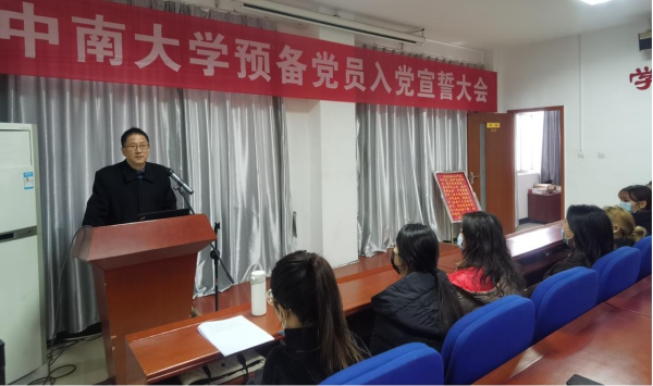 随后,张金学副书记向全体新发展党员表示祝贺,欢迎他们加入党的组织。他说入党宣誓是加入党组织的一个重要形式,这是党内政治生活的起点,因此他为全体同志提出三点要求:第一,认真学习党的基本理论。当下就是要把习近平新时代中国特色社会主义思想学懂、弄通、悟透,要掌握习近平总书记最新讲话精神,学习十九届五中全会精神,为接好社会主义现代化建设的接力棒、走好当代青年人生的长征路打好坚实的理论基础。第二,刻苦学习专业知识。广大同学将在十四五和二零三五远景规划目标实现的伟大进程中由旁观者变成参与者、组织者、决策者,只有明白自己的历史使命,才能在未来的工作中发挥作用、做出贡献,由此要珍惜在校生活,练就为人民服务的本领。第三,充分发挥先锋模范作用。在抗击疫情的伟大斗争中,党中央和各级党组织带领广大党员和全国各族人民为取得抗击新冠疫情人民战争、总体战、阻击战做出了艰辛的努力,所以党员同志要在党和人民需要的时候勇敢地站起来,在高校期间党员同志要带领全体同学认真学习文化课的知识、帮助有需要的同学健康成长顺利完成学业、积极开展批评和自我批评,引导和影响身边同学形成正确的世界观、人生观、价值观。他还为全体新发展党员佩戴党员工作牌,发放党建笔记本、U盘等学习用具,要求同志们践行誓言,在学生群体中亮明党员身份,做好表率,为党的事业不断奋斗。
