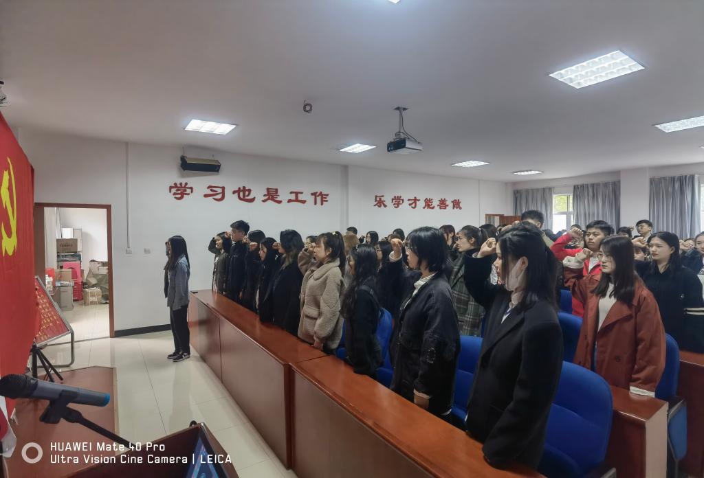 宣誓仪式在雄壮的国歌声中拉开帷幕。陈乐凯老师向参加宣誓仪式的党员讲述了入党宣誓仪式的特殊意义并宣读参加此次宣誓的党员名单。接着,在院分党校班导师李萌萌老师带领下,全体预备党员在党旗前庄严宣誓。