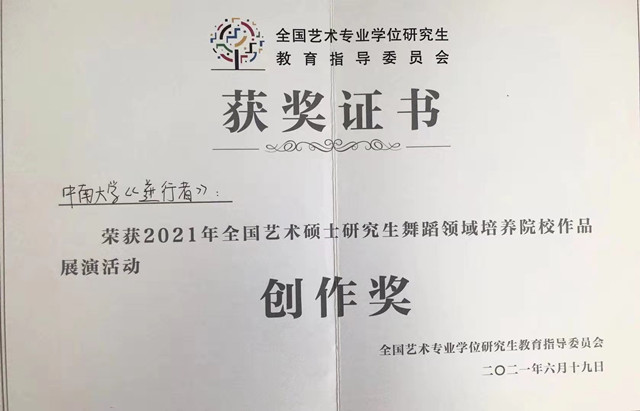 经过评审委员会初选,我院选送的作品大型原创音舞诗《中南故事》中的选段《逆行者》,从65所院校选送的116个作品中脱颖而出,在本次全国总决赛中以良好的精神风貌,精湛的表演和创意取得了评委的青睐,斩获“创作奖”。