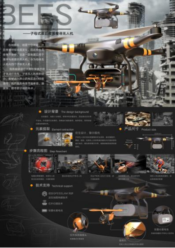 作品《BEES》是一款子母震后救援搜寻无人机,在地震后,地面十分崎岖,并且常常伴有余震发生,因此救生员非常不安全,这是一款地震后用于搜寻与救援的无人机,分为母体无人机与四个子体无人机。母体能够进行大面积搜索并给子体进行充电,子体无人机体积较小,能够进入狭小的地区进行仔细搜寻。此产品具有搜寻效率高、速度快、搜寻更仔细的特点。
