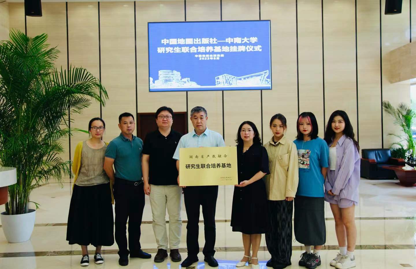 萧沁教授、中国地图出版社文化分社社长陈宇先生、分社总编卜庆华先生,设计总监方芳女士及在京实习的研究生代表一起参加挂牌仪式。