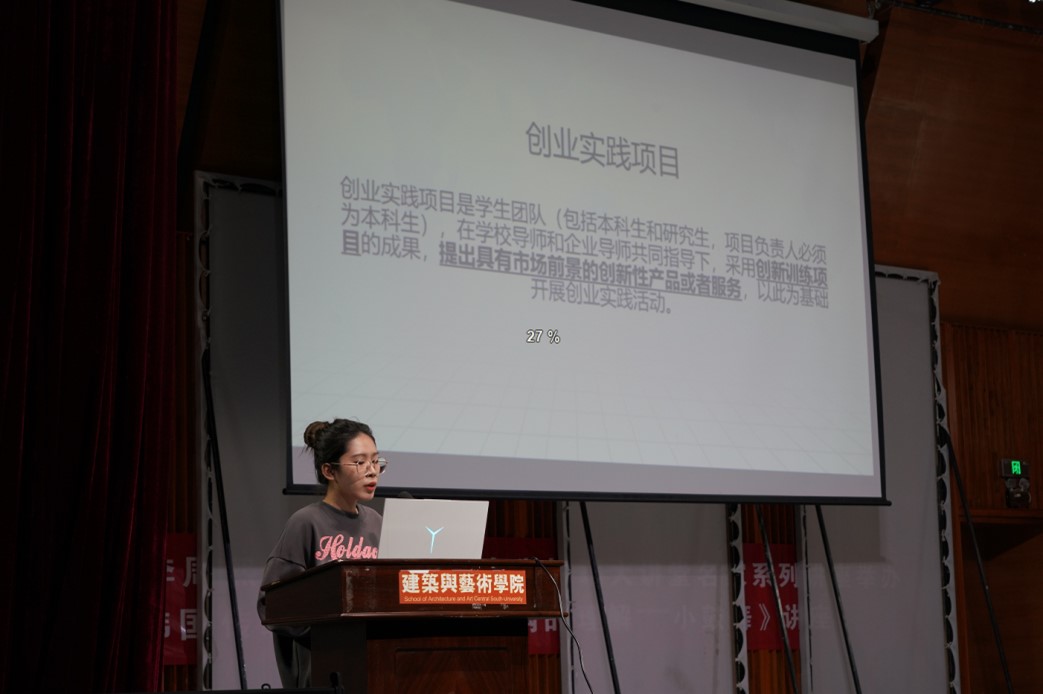 首先,院团委学术创新部陈子萱同学详细介绍了大学生创新创业的重要性,着重对创新创业项目类型、赛道以及流程进行了解释说明,具体讲解了项目申报要求与注意事项等。