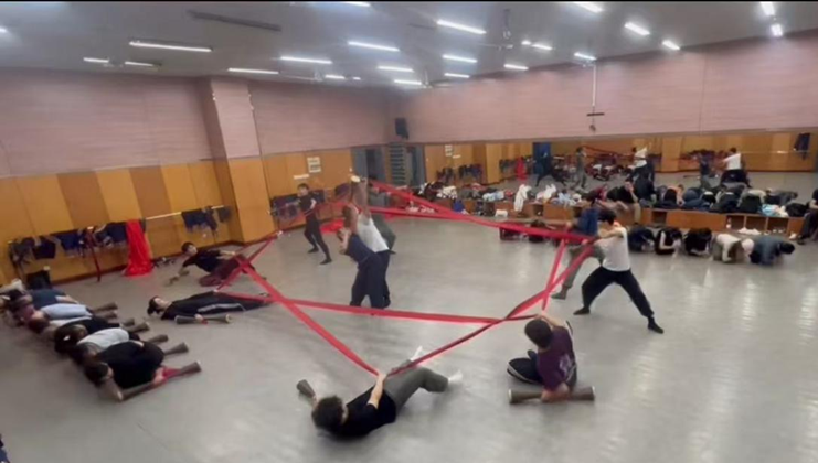 舞台上的精彩呈现,源自师生们对艺术的执着追求与对民族文化的匠心打磨。在编导伍彦谚、王峥老师的悉心指导下,由舞蹈表演专业28位同学组成的演出团队全身心投入复排。这次高强度的排练,作为舞表2201班一次重要的专业实践环节,不仅是对“绸巾长鼓舞”非遗技艺的深入学习,更是一场锤炼专业意志、凝聚团队精神的实践。同学们在守正——尊重非遗本真性,与创新——契合当代审美之间寻求平衡,反复雕琢每一个动作与表情,使古老的非遗在新时代舞台上焕发新的生命力,完成了对民族文化血脉的赓续。