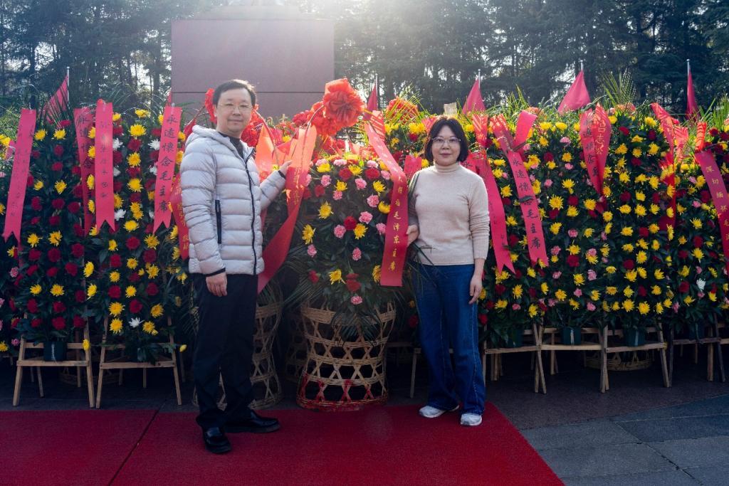 在毛泽东同志铜像广场,教师们整齐列队,神情庄重。设计系教师代表徐鸣副院长和李志榕副院长手扶花篮缓步上前,将花篮轻放于铜像前,并仔细整理缎带。缎带上“深切缅怀毛泽东同志”,之后带领设计系全体教师鞠躬致敬,并带领全体教师环绕铜像缓行一周,行注目礼,深切缅怀伟人。