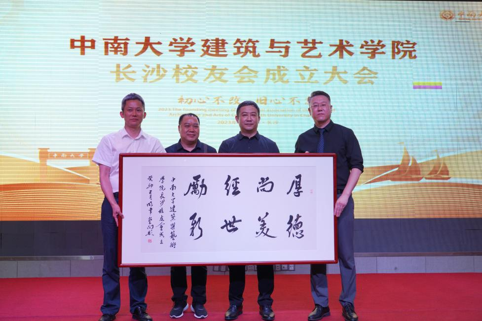 | 柯朝晖书记代表学院向长沙校友会赠送了向彬教授创作的书法作品——《厚德尚美,经世励新》 |