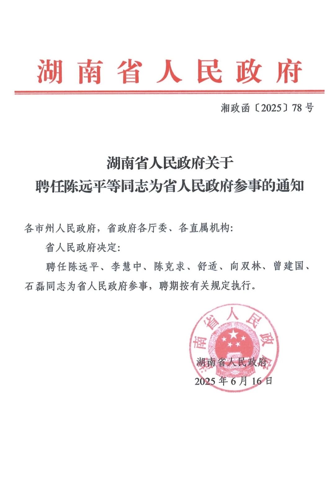 近日,湖南省人民政府发布《关于聘任陈远平等同志为省人民政府参事的通知》(湘政函〔2025〕78号)。玛雅论坛 院长石磊教授获聘省政府参事。